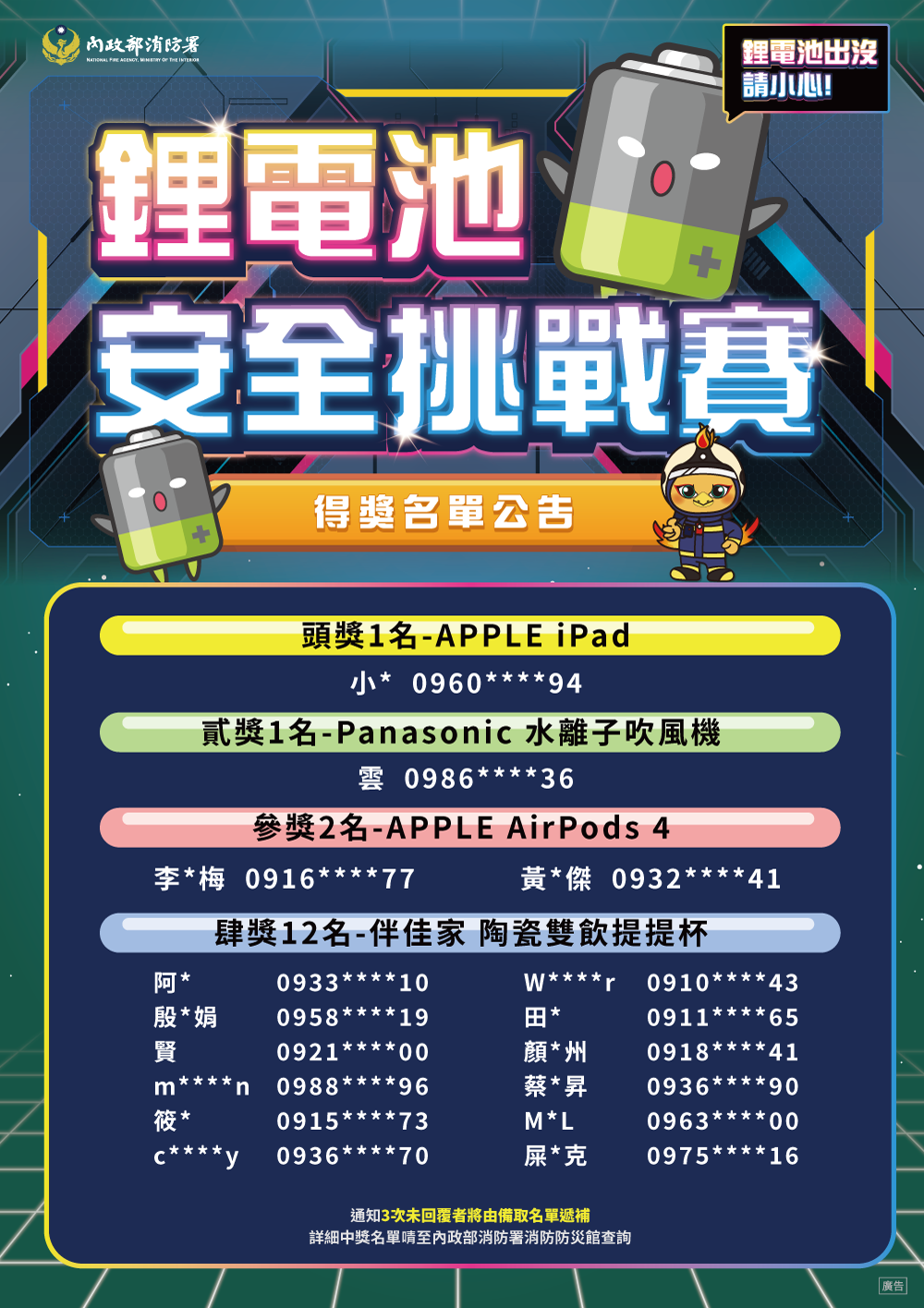 鋰電池安全挑戰賽-宣導活動中獎名單